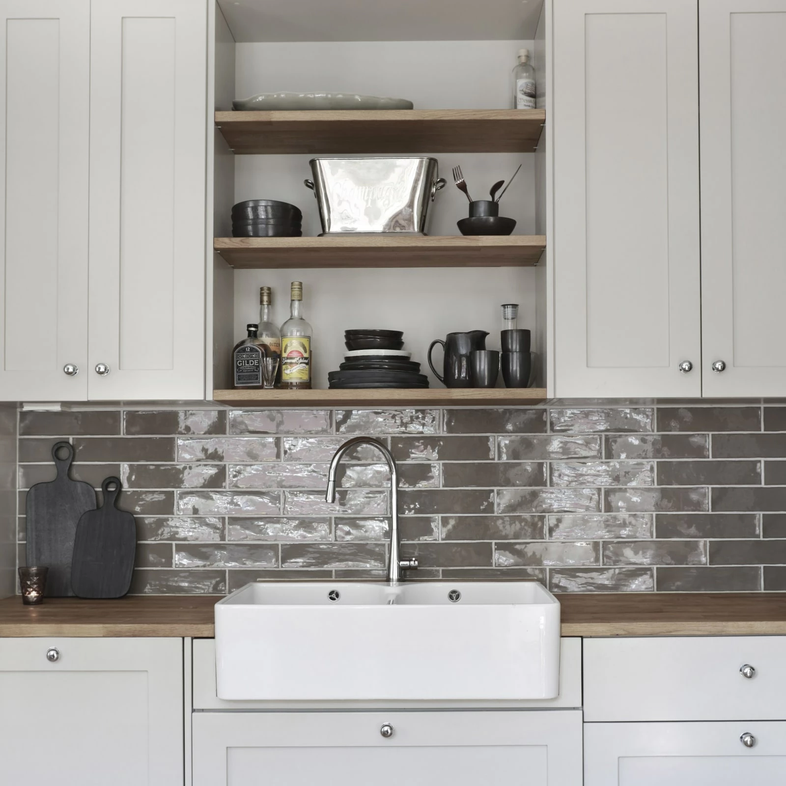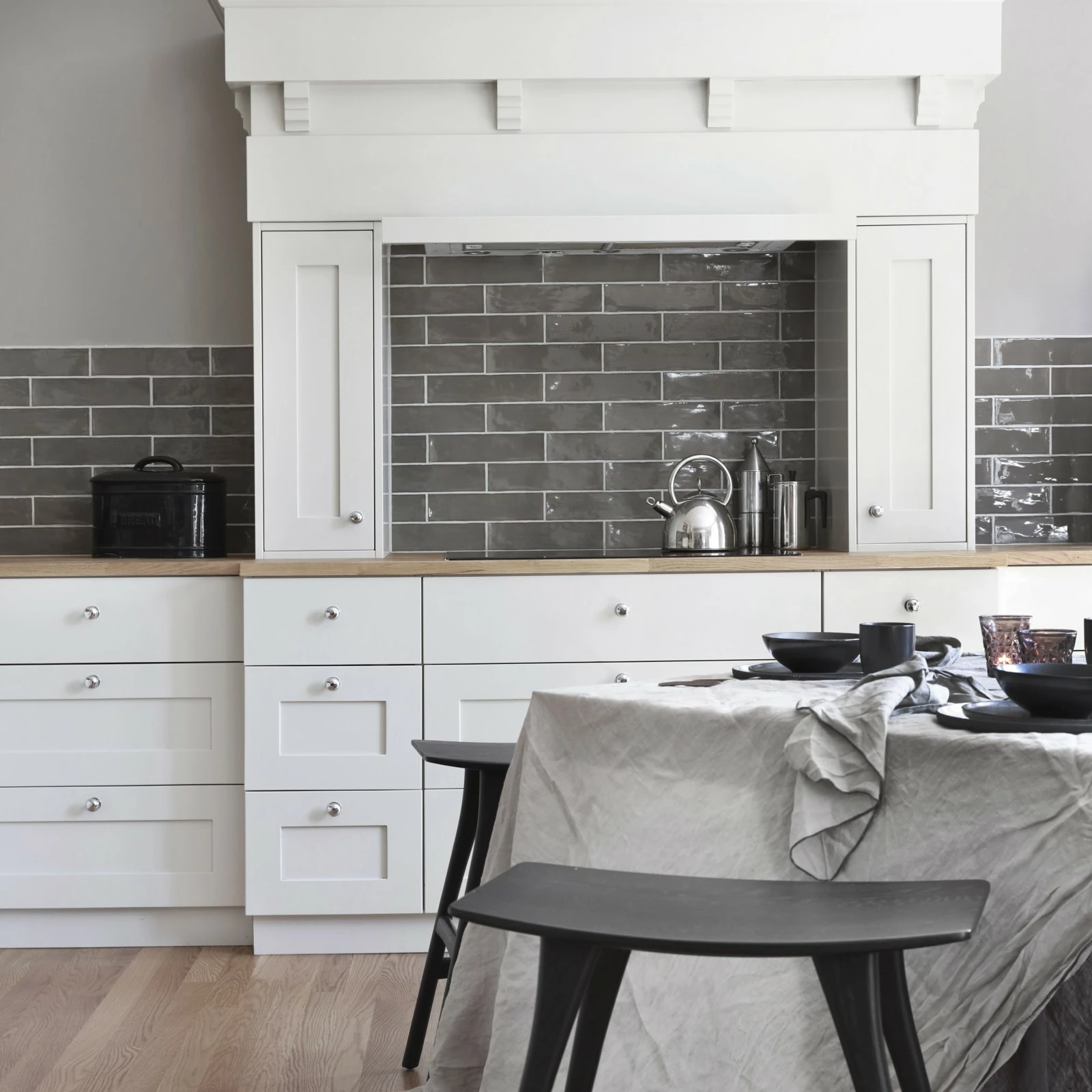 Devon Light Grey 7,5×30 brukes gjerne på mer moderne kjøkken og gir et urbant inntrykk.
