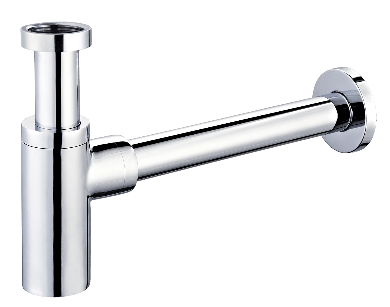 Universal vannlås med 1 1/4″ gjenger for montering i servantens bunnventil. Inkludert 30 cm forkrommet rør som går ut fra vannlåsen og 8,5 cm vertikal rørlengde. I tillegg følger det med en dekor ring som gir en pen avslutning mot vegg. Anbefales for servanter med synlig avløp.