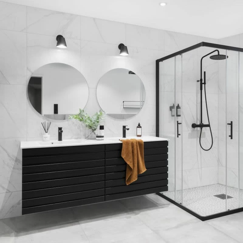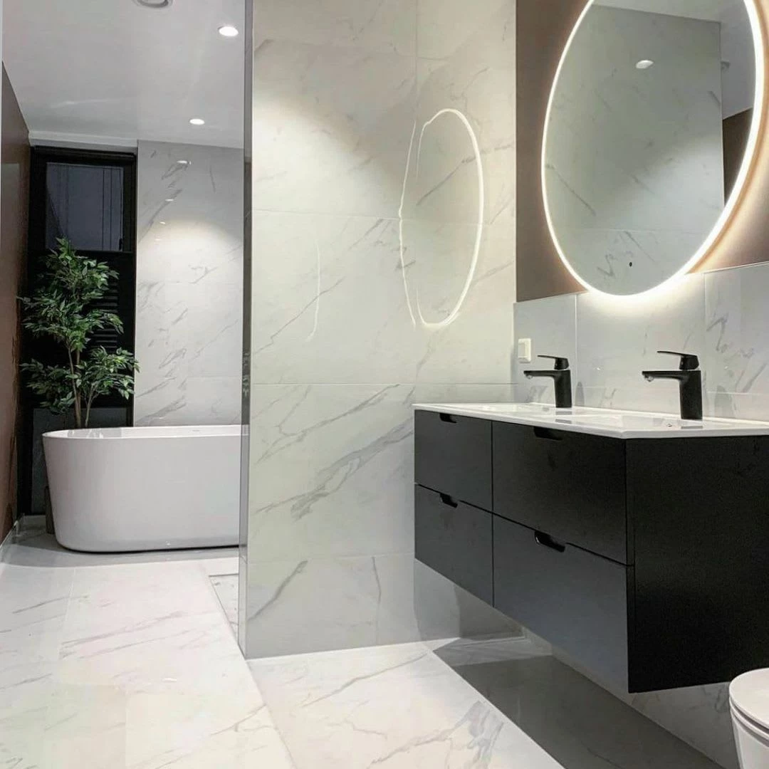 Flisen har et mønster lignende den verdenskjente italienske Carrara-marmoren, og er påført glasur og deretter høyglanspolert. Dette gir et veldig naturtro og eksklusivt uttrykk.