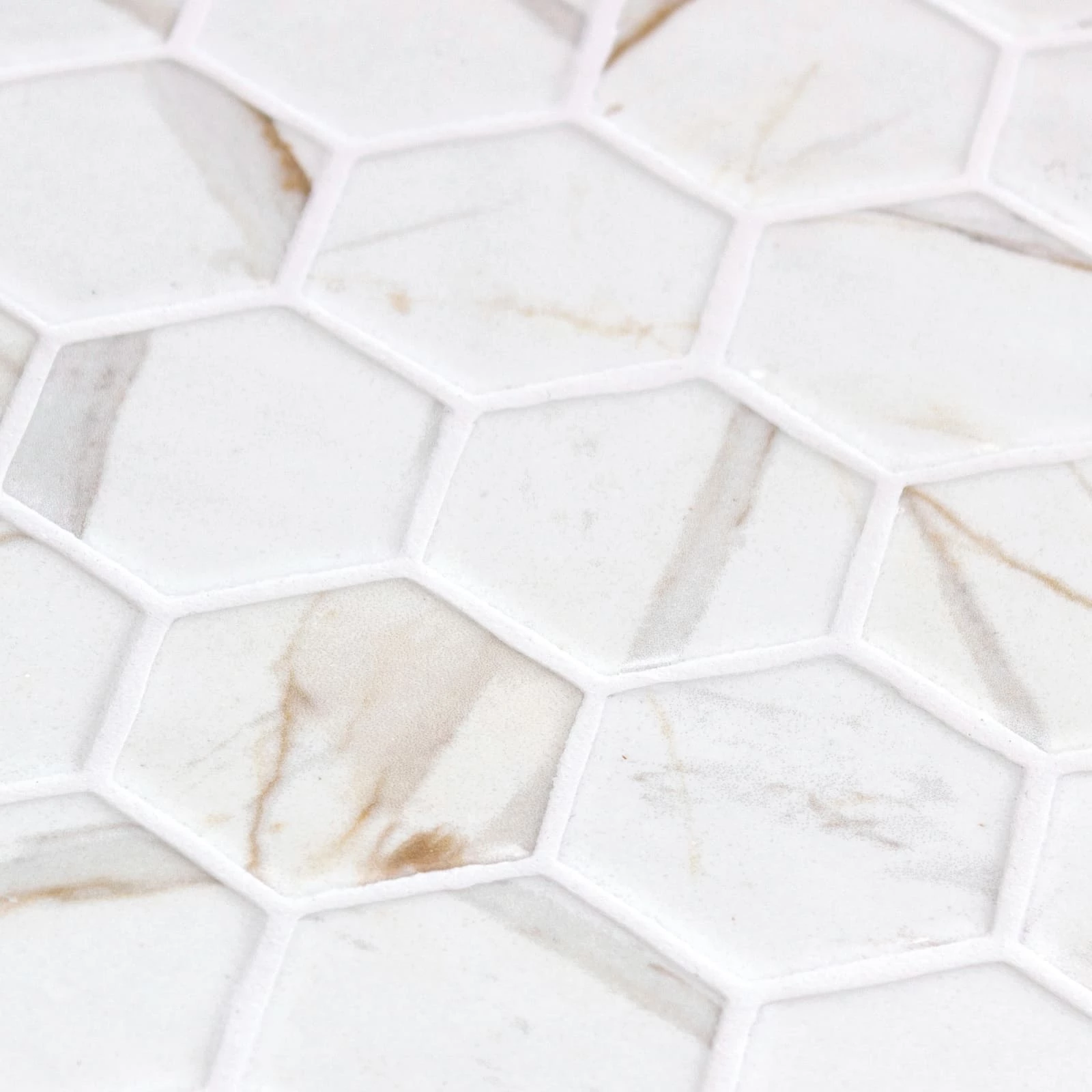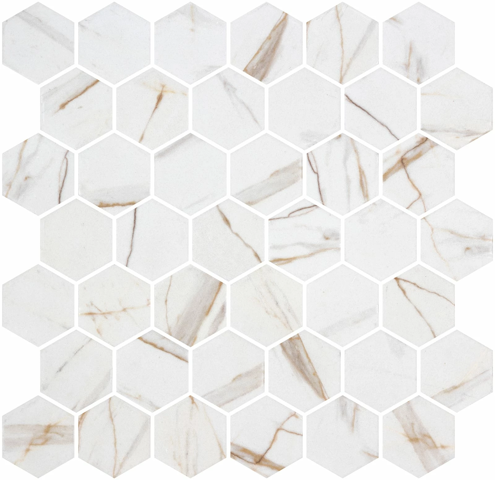 Hex XL Calacatta Gold brukes gjerne i dusjsonen eller som dekor sammen med mange av våre større fliser. Mange velger å bruke flisen sammen med og .
