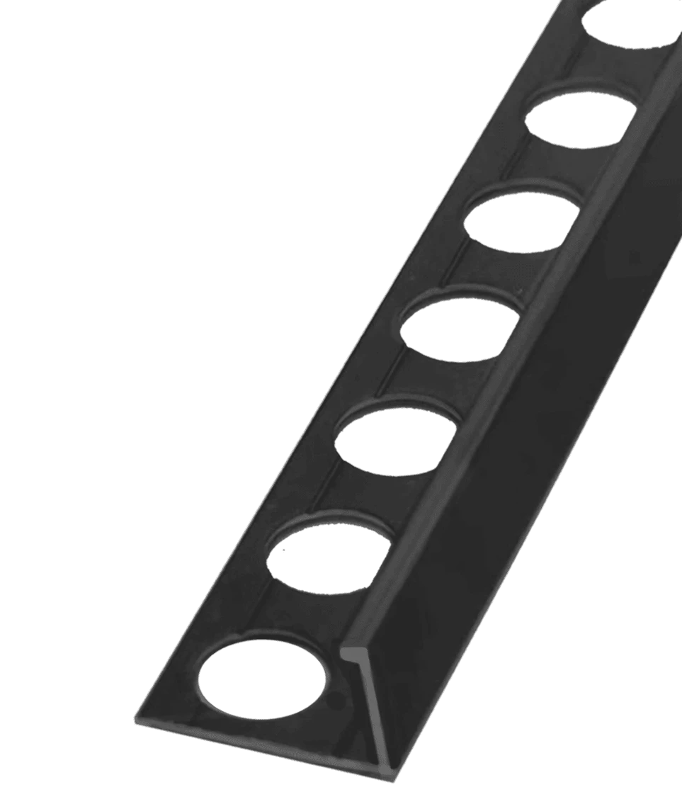Trendy kantet L-list formet hjørnelist i sort matt farge for bruk på utvendig hjørne ved flislegging. Listen gir et minimalistisk uttrykk. Lengde 2,5 m