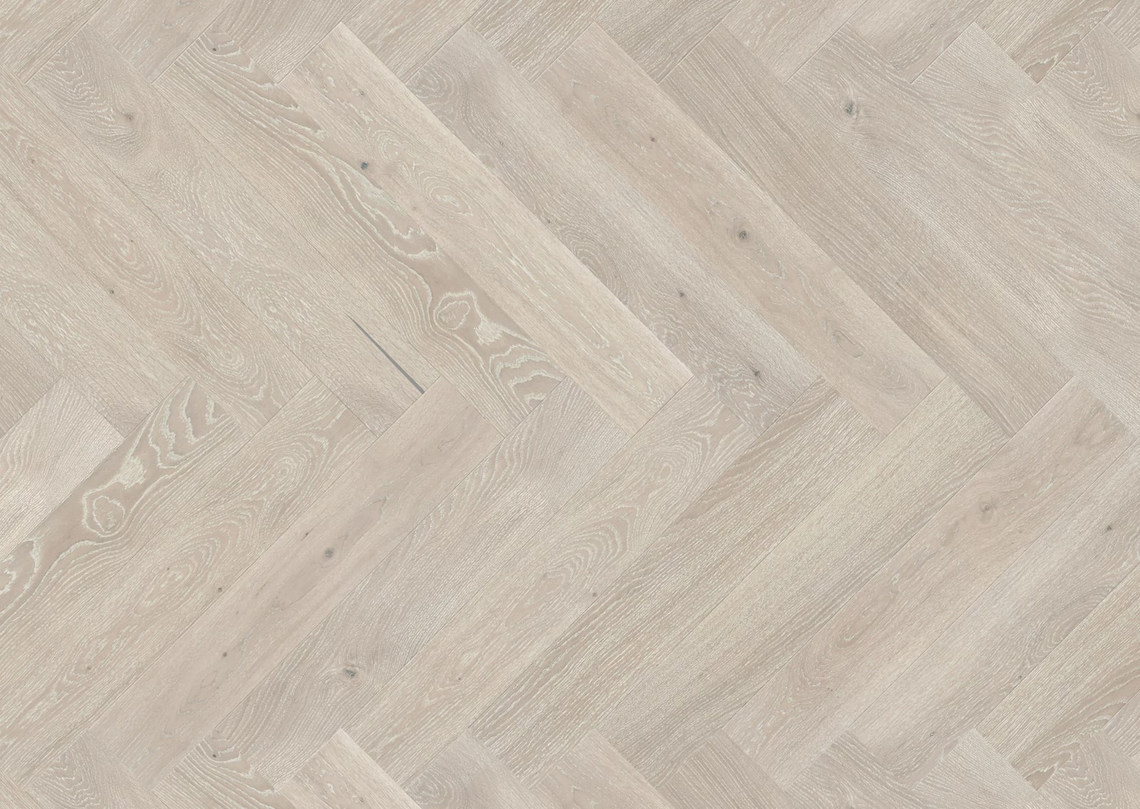 Holz Eik Frost Fiskebein Parkett er mikrofaset på alle fire sider, som gir en subtil overgang mellom hvert panel og skaper et sømløst og sammenhengende utseende. Den børstede finishen gir også en følelse av tekstur og dybde til overflaten, og legger til en ekstra dimensjon til gulvets elegante utseende.