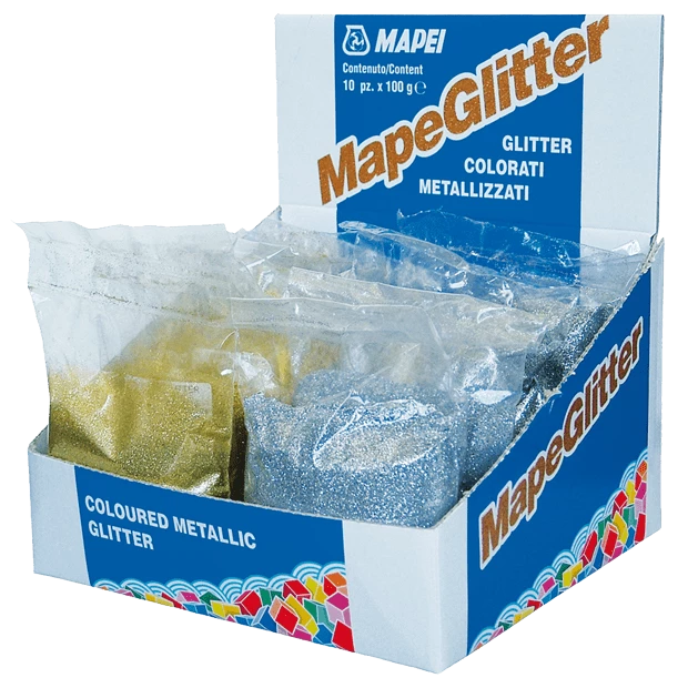 Mapeglitter legges til i Kerapoxy Design i opptil 10% vekt for å danne fugemørtel med en glitrende, metallisk finish og er spesielt anbefalt for metalliske fliser og glassfliser samt mosaikk.