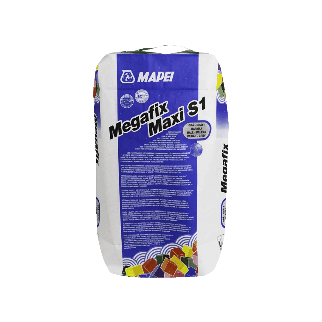 Fleksibelt, sigestabilt lim for keramiske fliser og naturstein. Megafix Maxi S1 flislim med low-dust som gir opptil 80 % reduksjon av støv under utblanding.