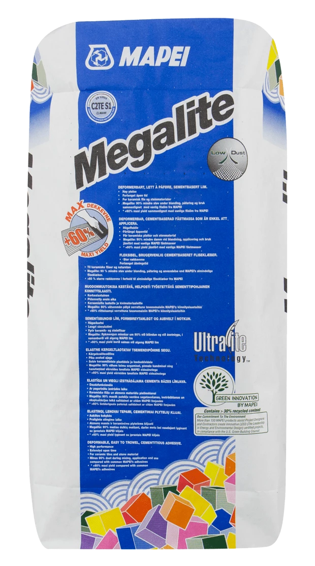 0,8 kg/m² pr. mm tykkelse, tilsvarende normalt 1,5 – 2,5 kg/m². LAGRING Megalite S1, kan lagres opp til 12 måneder i uåpnet original emballasje og på et tørt sted. Produktet er i samsvar med kravene i Annex XVII av regulativet (EC) No 1907/2006 (REACH), punkt 47.