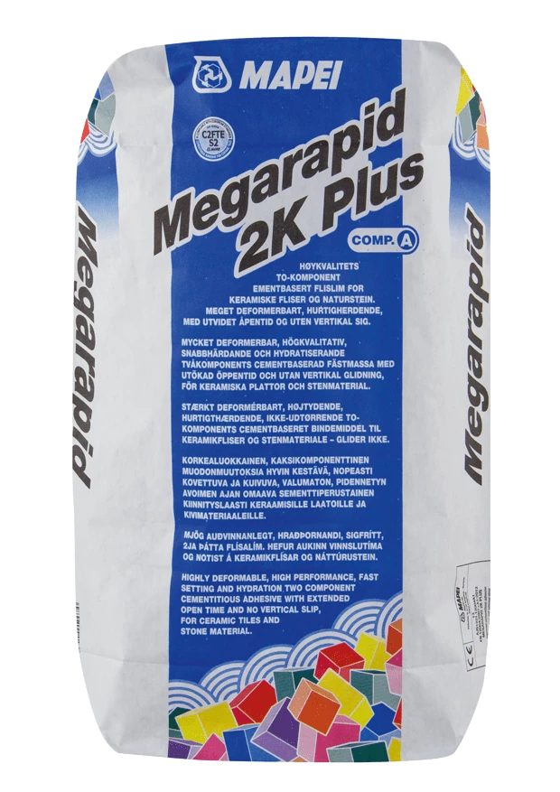 Megarapid 2K Plus er et forbedret (2), hurtigherdende (F) sementbasert (C) lim, uten sig (T) og med forlenget åpentid (E), som tilhører klasse C2FTE S2. KLASSIFISERING I HENHOLD TIL EN 12002 Megarapid 2K Plus er et meget fleksibelt sementbasert lim, som tilhører klasse S2. Megarapid 2K Plus er CE-merket, som angitt i ITT sertifikat Nr. 25070277/Gi (TUM) utstedt av laboratoriet ved Technische Universität München (Tyskland).