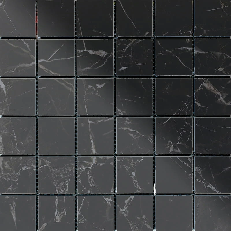 Mosaic Night Elf Polished 5×5 Rectified er påført glasur og deretter høyglanspolert. Den speilaktige overflaten gir et naturtro og eksklusivt uttrykk.