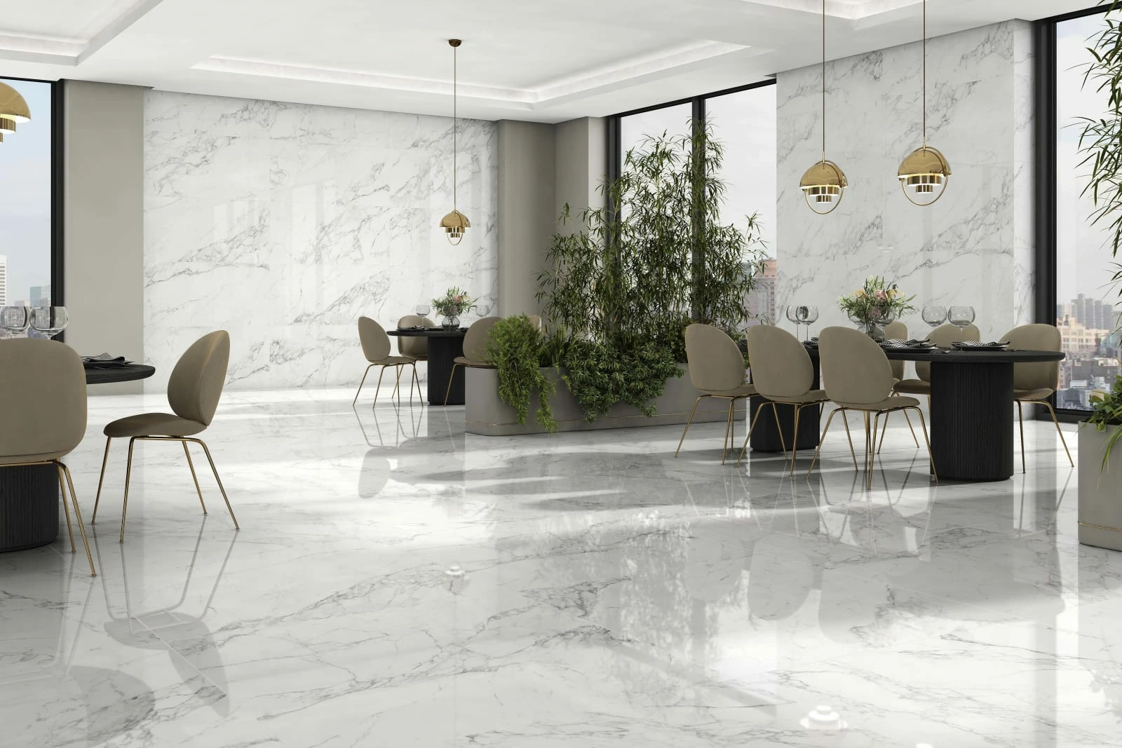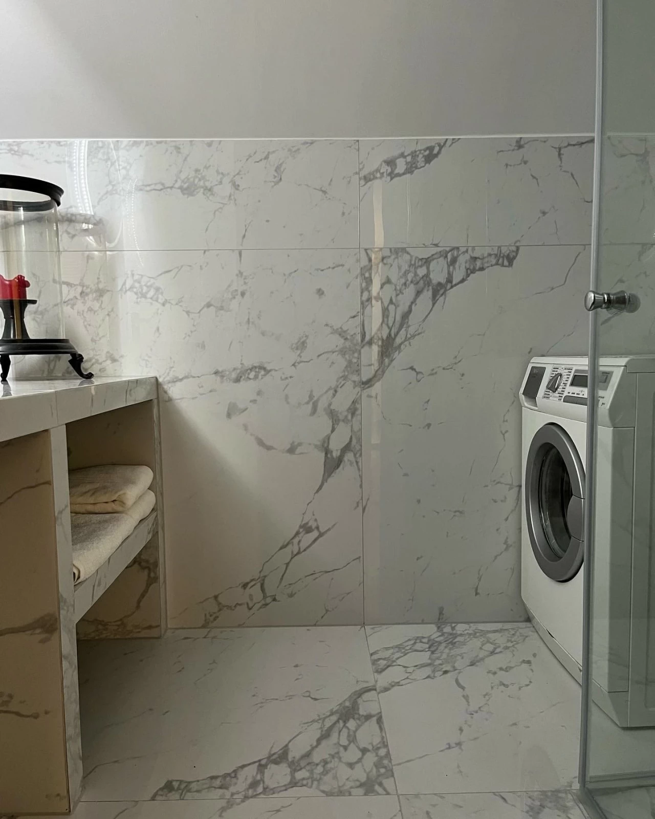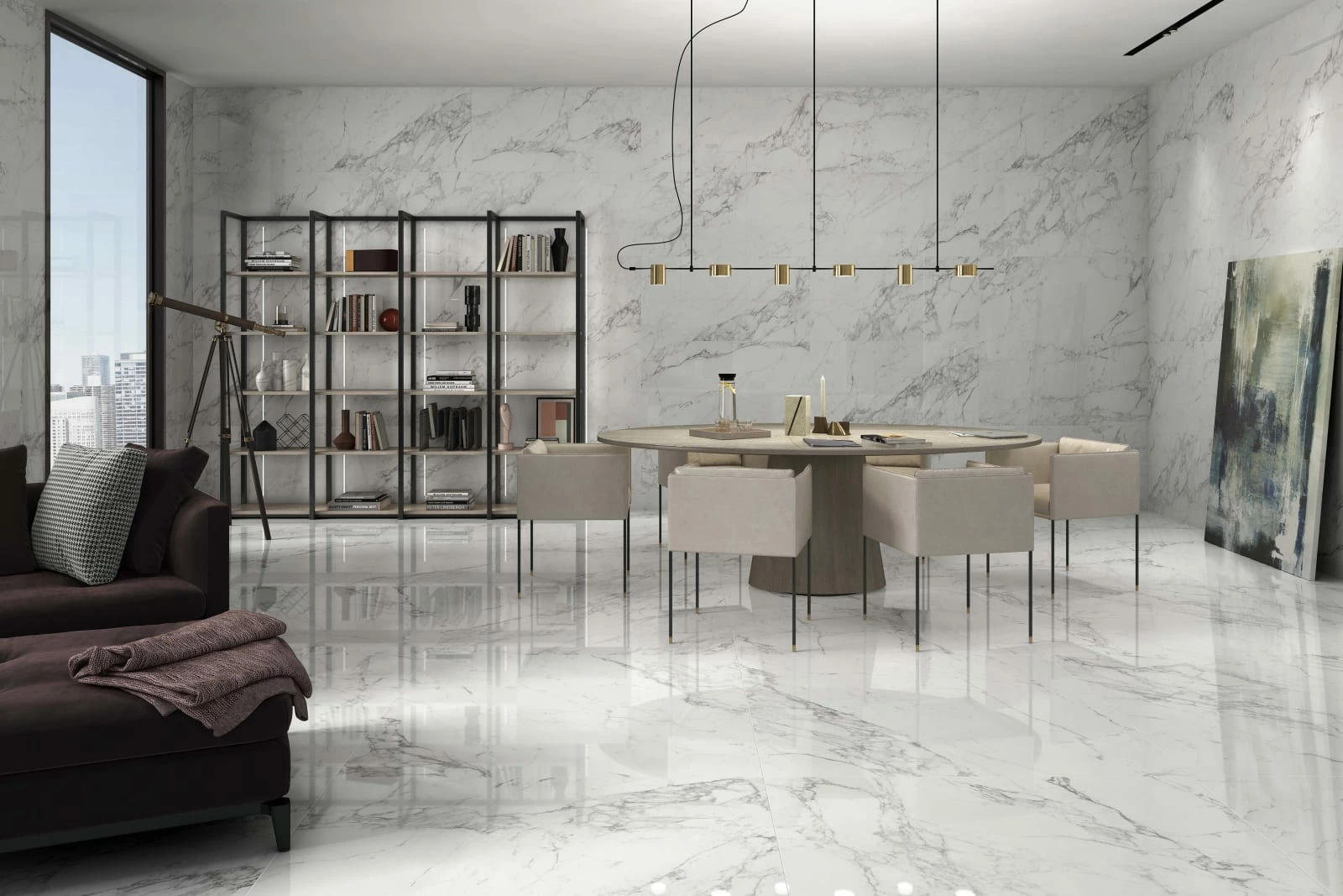 Ønsker du et rom utenom det vanlige, kan du kombinere Pulido Sabine White 120×120 med på vegg.