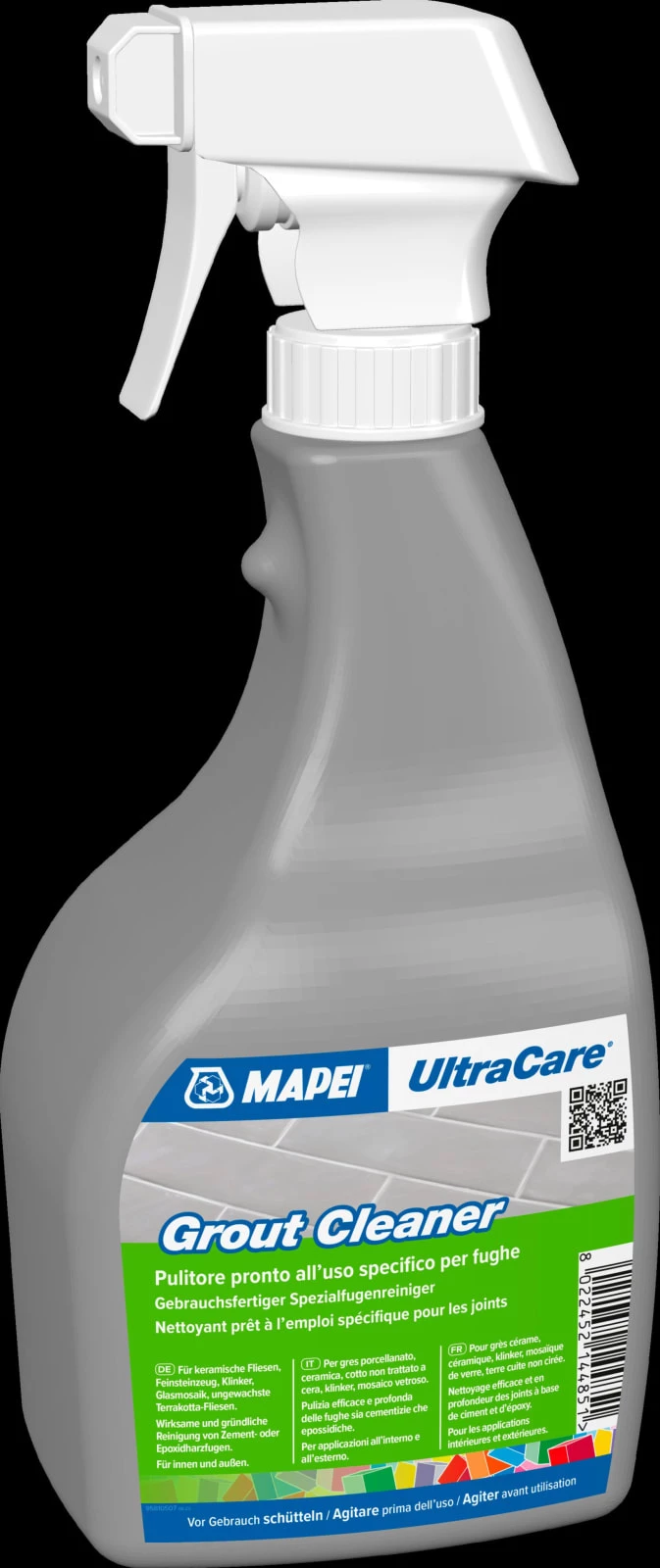 ULTRACARE GROUT CLEANER er et profesjonellt klar til bruk rengjøringsmiddel for rengjøring av fuger på vegg og gulv, innvendig og utvending. Til keramiske fliser, porcelenato, klinker, glassmosaikk og uvoksede terracottafliser. Produktet er effektivt til dyprensing av sement- og epoksybaserte fugemasser.